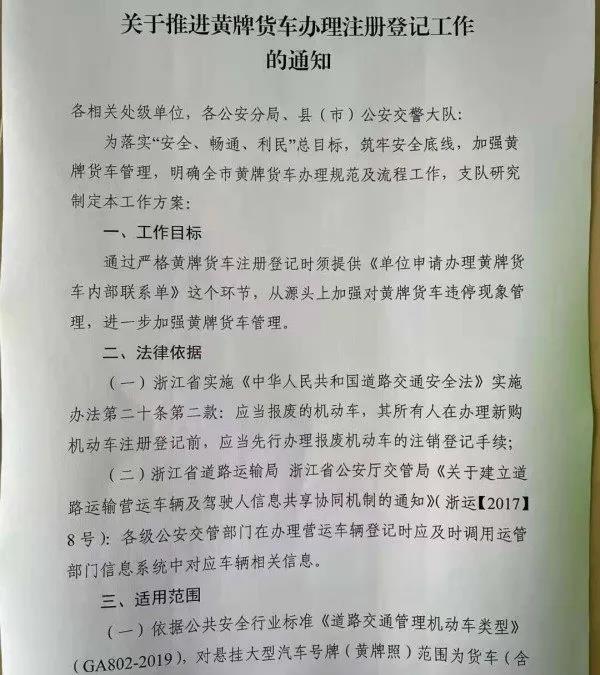 ●  浙江:黄牌车上牌要满足3个硬条件近日,浙江“黄牌货车办理登记注册”出台新要求,从文件内容来看,如果购车单位不满足以下几个条件,货车一律不准上牌。